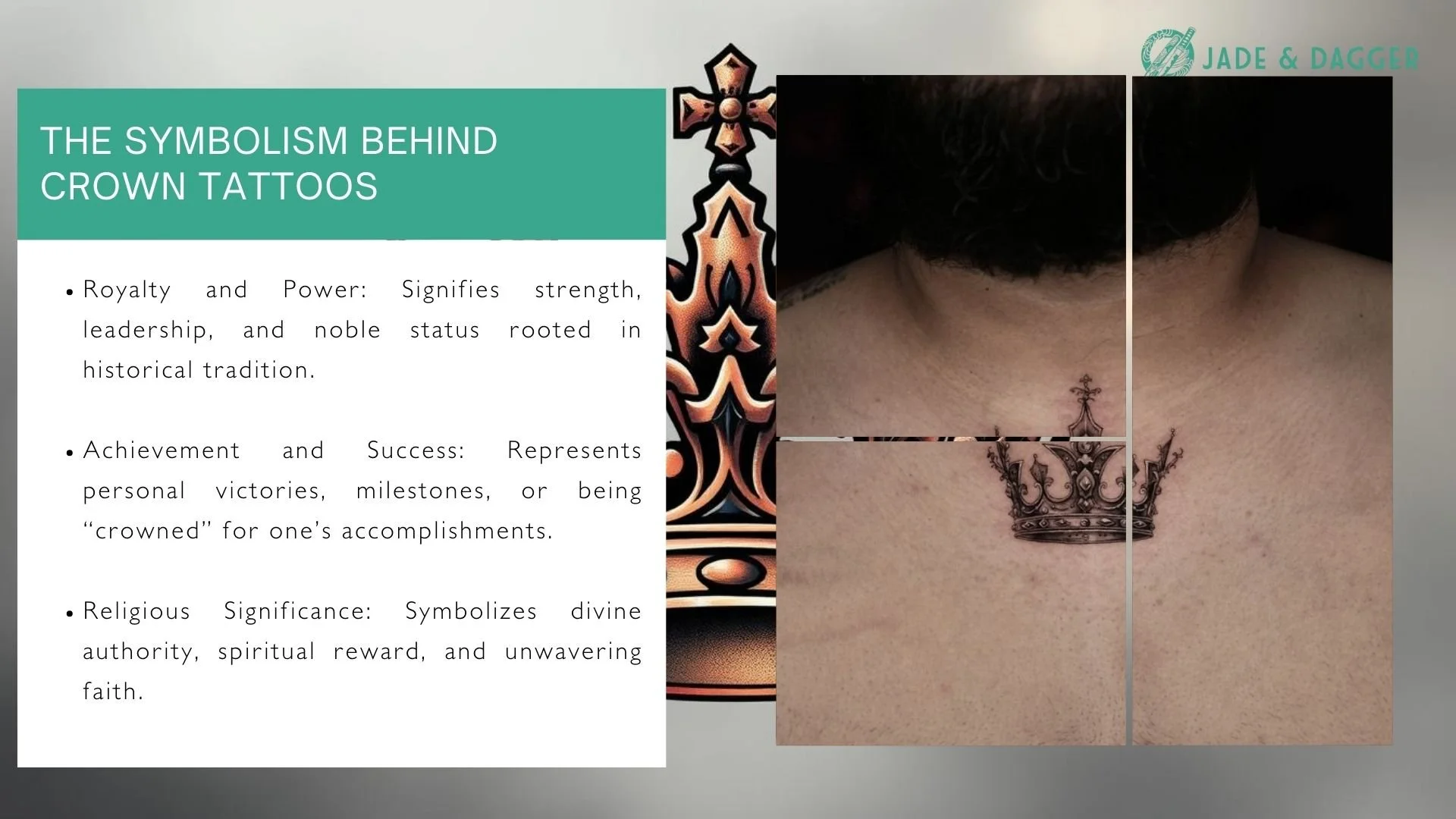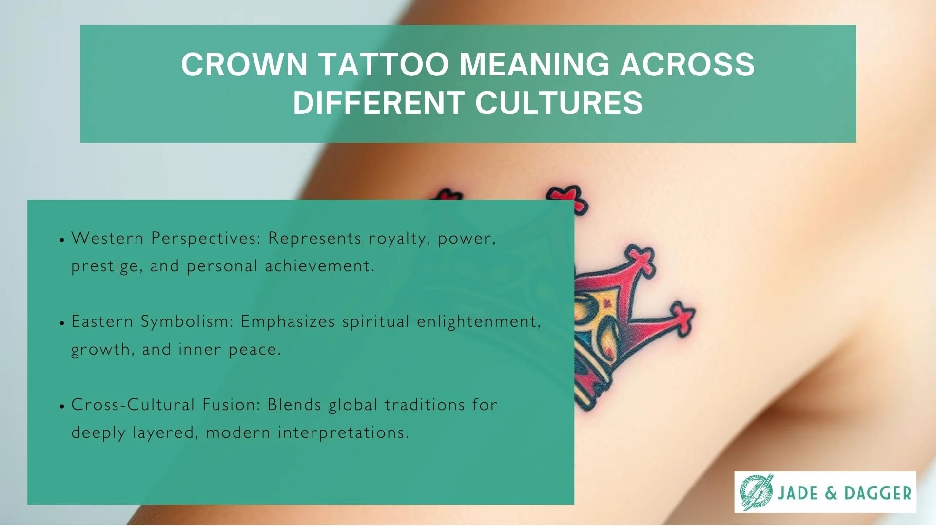 Jade & Dagger Tattoo offers expert guidance on crown tattoo designs and placement options.