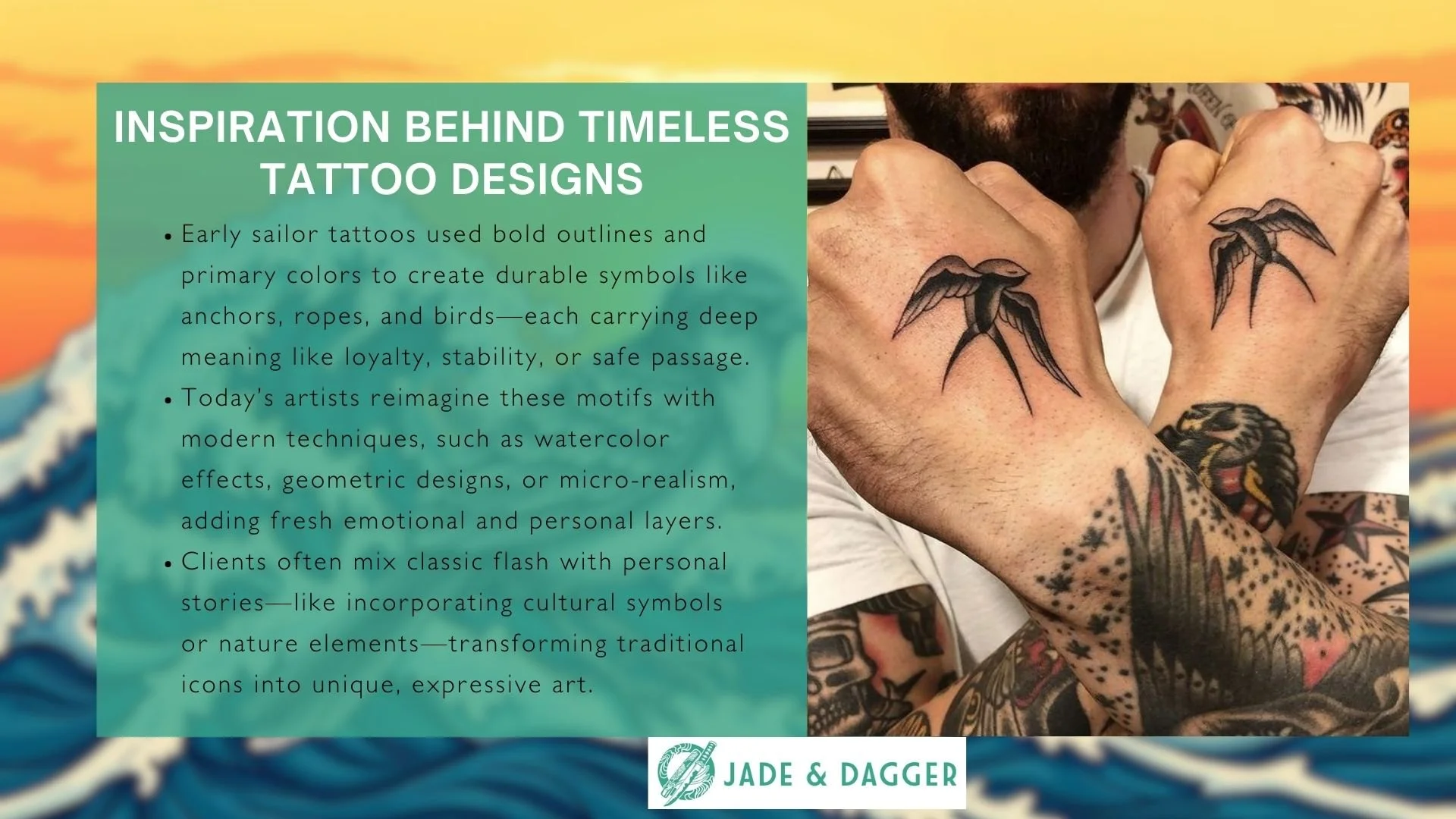 At Jade & Dagger Tattoo, we’ve seen these small, bold birds soar beyond their nautical roots into modern art. What started as a sailor’s symbol of resilience now carries layered stories for today’s wearers. Whether you’re drawn to tradition or crave a fresh twist, understanding their history adds depth to your ink.