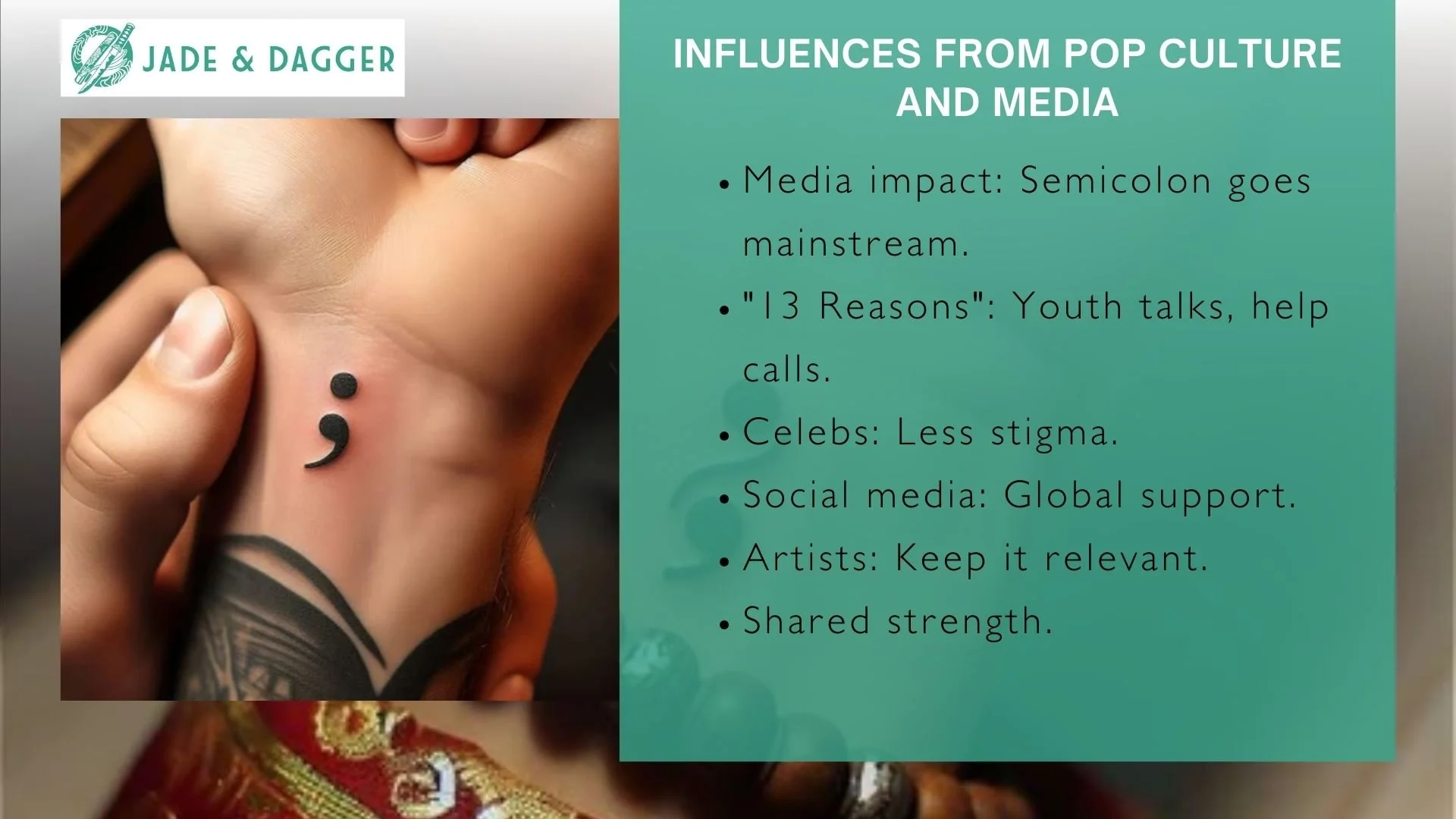 Amy Bleuel's Project Semicolon found unexpected allies in pop culture. After Demi Lovato showcased her design in 2016, Calgary studios reported triple bookings for punctuation-inspired ink. "Suddenly, grandparents asked about semicolons during Sunday dinners," notes a Jade & Dagger artist.