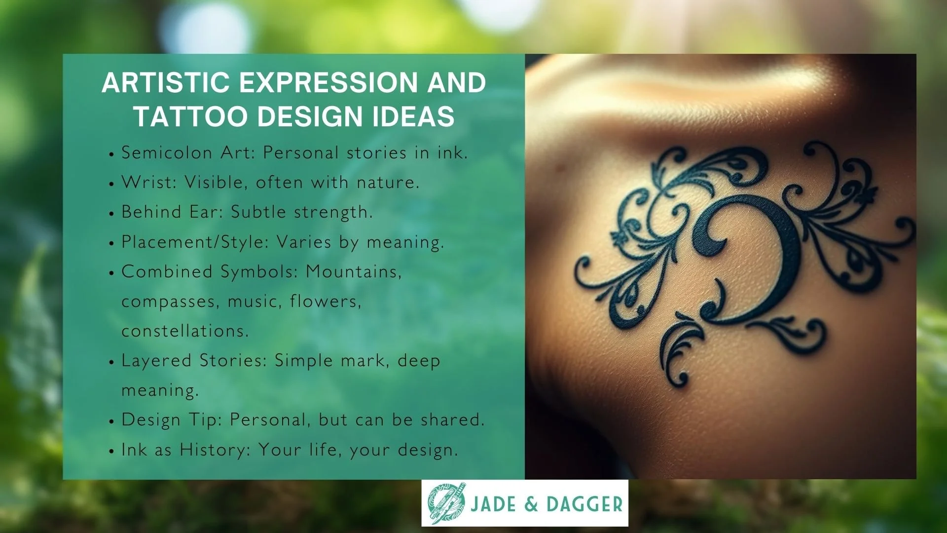 TV shows and musicians helped the design cross into pop territory. While some wear it for mental health advocacy, others embrace its grammatical charm. Studios like Jade & Dagger innovate by weaving the semicolon into larger nature scenes or abstract patterns.